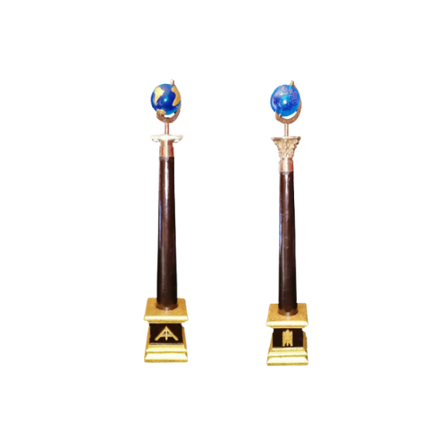 L’ensemble colonnettes maçonniques Premier & Second Surveillants avec voûtes réunit deux éléments symboliques essentiels du mobilier rituel : les colonnettes du Premier et du Second Surveillant et les voûtes céleste et terrestre associées à leur fonction. Cet ensemble enrichit l’espace rituel en donnant une représentation visuelle claire des responsabilités des officiants ainsi qu’une illustration de la dualité du macrocosme et du microcosme inhérente à la tradition maçonnique.
