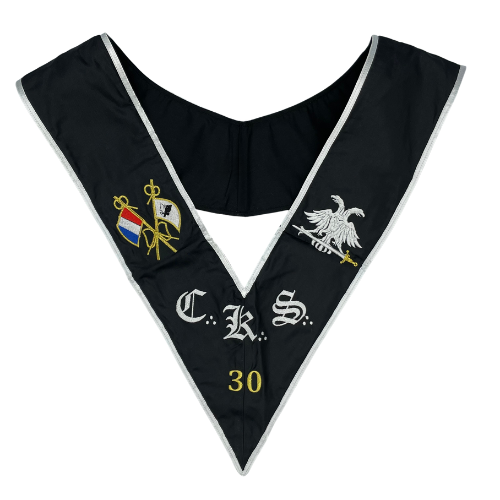 Sautoir CKS 30ème degré REAA - Trois Fois Puissant Grand Maître Chevalier Kadosh, disponible en soie ou moiré. Attribut rituel symbolique incarnant justice, droiture et progression initiatique au sein du Rite Écossais Ancien Accepté.