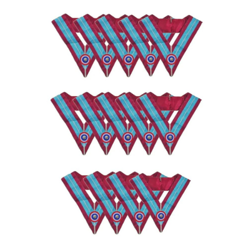 Ensemble 14 Sautoirs Officiers La Marque en tissu moiré ou soie, lot complet pour équiper chaque officier d’un atelier de la Maçonnerie de la Marque avec des attributs rituels coordonnés.