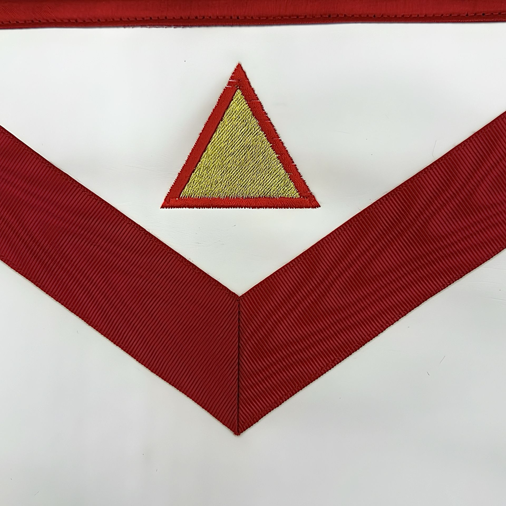 La finition du tablier reflète la dignité accrue du grade de Secrétaire Intime, tout en respectant la sobriété rituelle propre au REAA.
