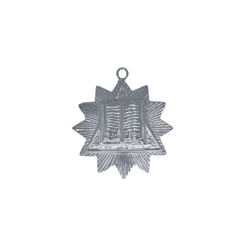 Bijou Chapelain Rite Emulation en airain argenté. Insigne rituel symbolique incarnant bienveillance, soutien spirituel et service fraternel au sein du Rite Emulation.