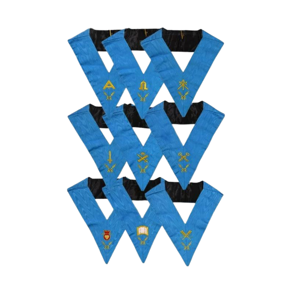 Dans la tradition maçonnique, les sautoirs d’officiers représentent les fonctions rituelles et symboliques de chaque membre du collège. Ils permettent une identification claire des responsabilités et renforcent l’organisation harmonieuse des travaux de l’atelier. Un collège bien décoré favorise la régularité des cérémonies et reflète l’ordre initiatique de la loge, chaque officier contribuant à la vie rituelle et fraternelle.