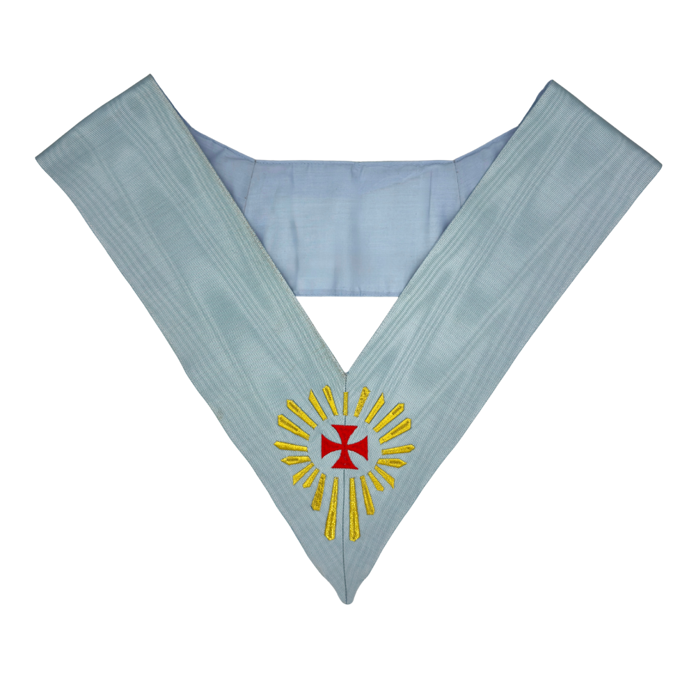 Découvrez le Sautoir de Vénérable Maître RER, conçu spécialement pour les Vénérables Maîtres du Régime Écossais Rectifié. Ce sautoir est fabriqué en soie luxueuse ou moiré bleu ciel, orné de bordures dorées et de deux soutaches, avec un bossoir doré, symbolisant le prestige et la responsabilité inhérents à la fonction.